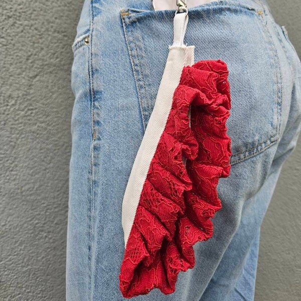 Each wristband is handmade from reclaimed jeans, decorated with pleated lace-like fabric — sourced from vintage clothing and old curtains. The lace isn’t traditional lace, but soft textured fabric that once lived another life.